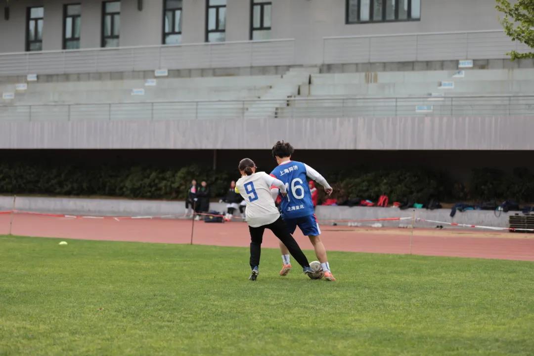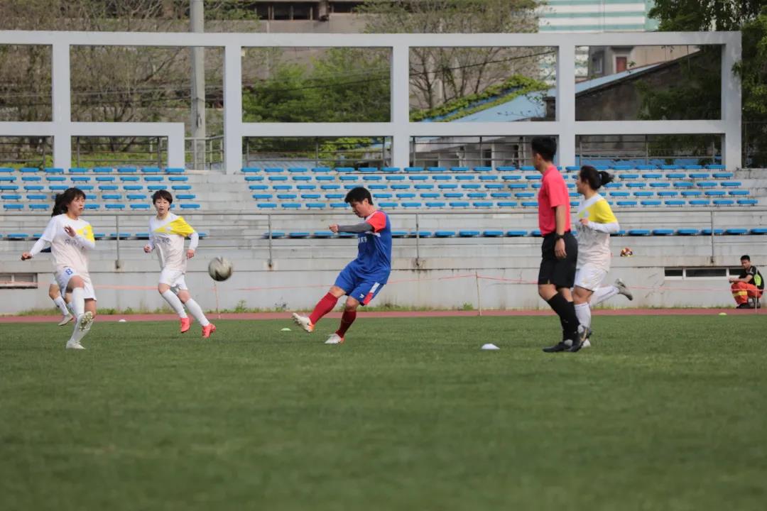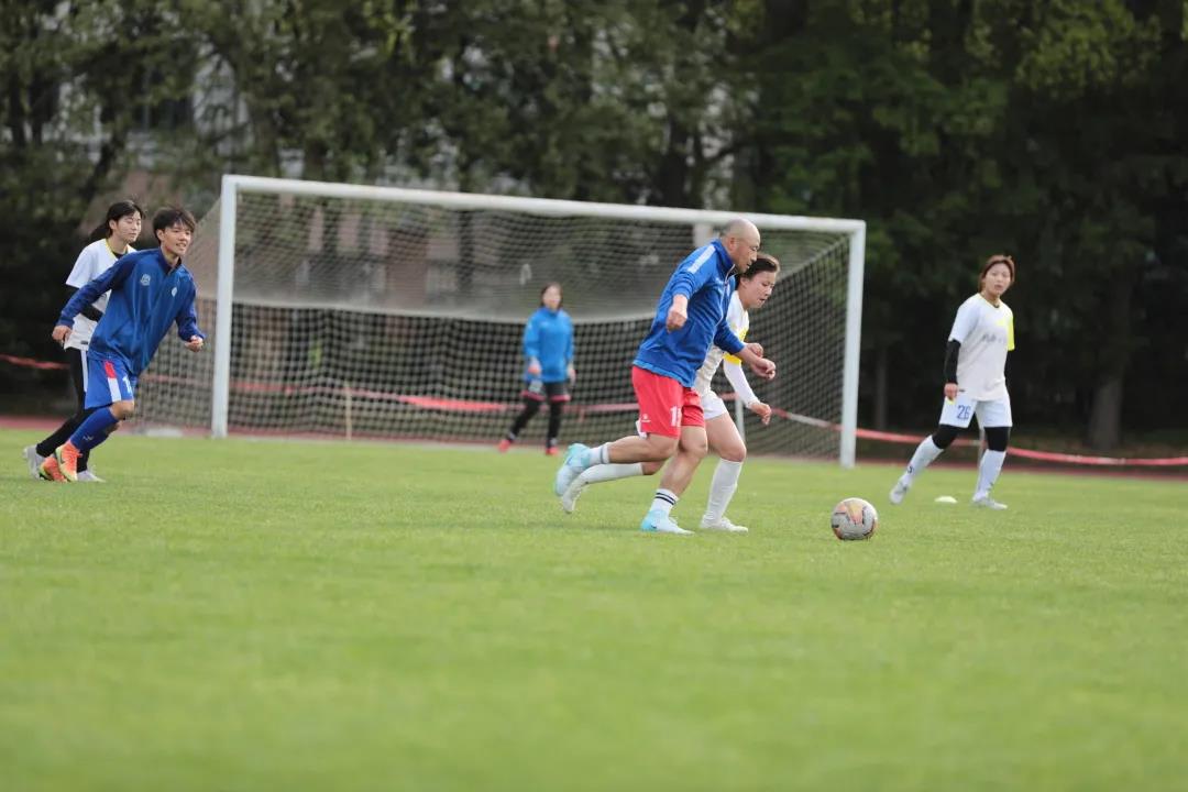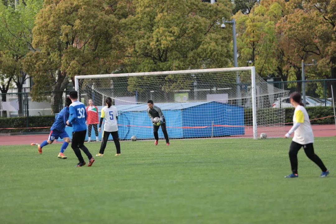 男方后场的曲圣卿老师和季斌老师也多次拦截横穿并迅速向前场推进。第38分钟,女足中锋曹嘉仪同学接到后场原紫薇同学的长传后一脚吊门直接攻破了男方的大门。1:1!