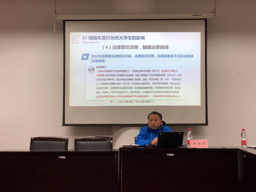 讲座中,汪老师带领大家回顾了我们国家近些年来取得的巨大成就。随着科技的进步和经济的发展,人民生活稳步提高,我国高等教育也逐步繁荣。但与此同时,国家也面临诸多考验。汪老师以最近的热点事件华为副总裁孟晚舟被捕为例,表达了对他国无视国际法规、漠视人权的严肃抗议,也提醒同学们要以此为鉴,认识到法规和规范的重要性。之后,汪老师介绍了相关的网络行为要求及法规,并结合案例讲述了不同的网络失范行为对老员工的不良影响。