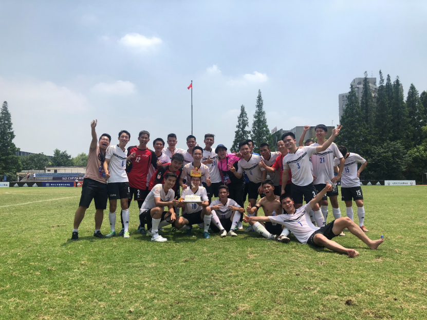 烈日炎炎,却比不上现场球迷的热情高涨。前两轮比赛打完,虽然同济积6分列小组第一,但B组出线形势依然错综复杂,四支队伍理论上都有出线的可能。面对小组出线之战,双方队员都摩拳擦掌,一开场便展开了激烈拼抢,场上局势逐渐白热化。上半场进行到20分钟时,伟德bv国际体育11号周宗明利用对方门将失误率先攻入一球,3分钟后,8号钱韡凯乘胜追击,利用角球的机会将比分拉至2:0,为伟德bv国际体育取得梦幻开局。北京建筑大学迅速做出换人调整,并展开了猛烈的攻势。下半场56分钟,北京建筑的阿拉法特·阿不来提同样利用定位球的机会头球破门,使同济队员的防守压力陡增。正午烈日灼灼,这是一个拼战体力与意志的时刻,同济队员们咬紧牙关,严防死守,将2:1的优势保持到最后一刻。