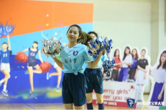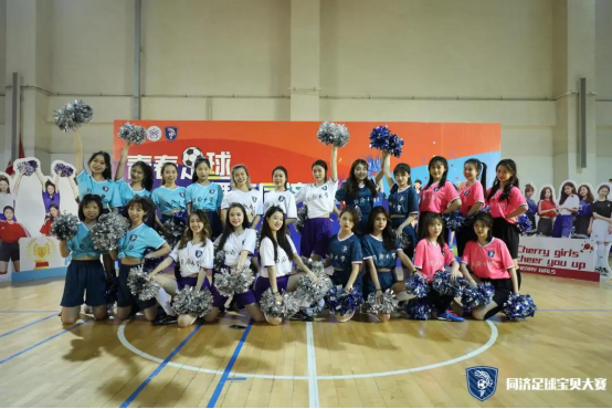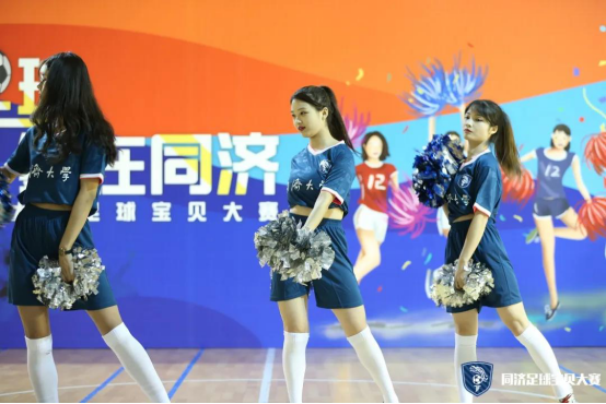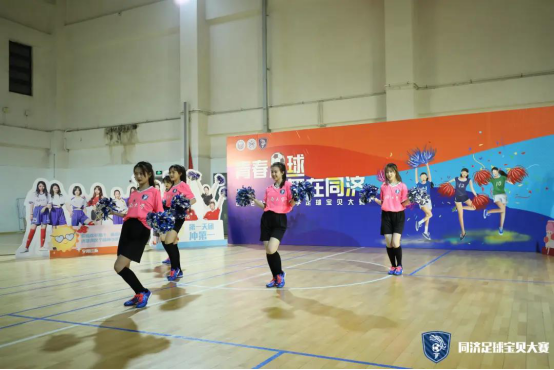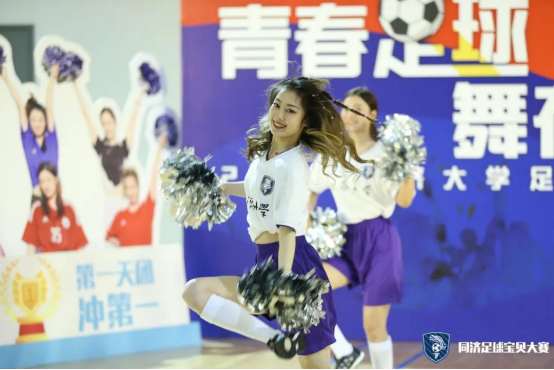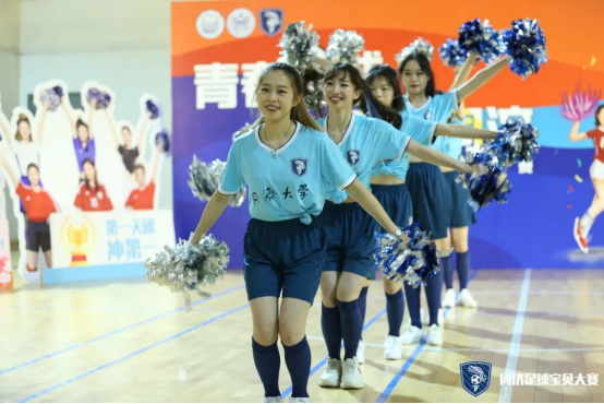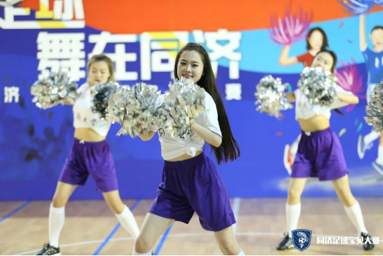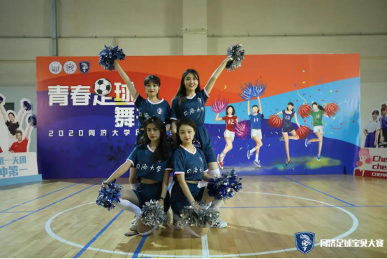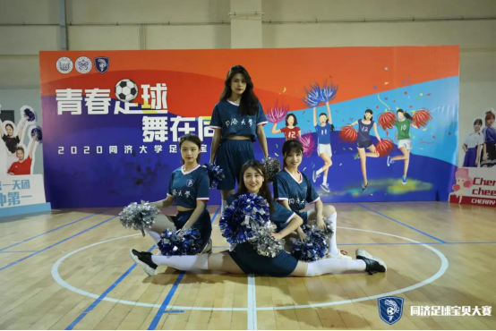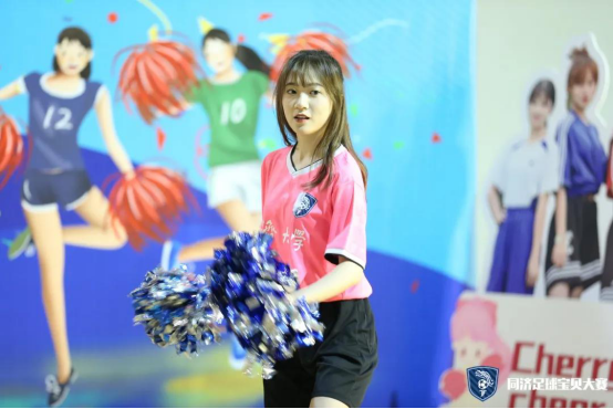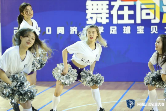 第一支登场的队伍是cherry girls,她们的口号是cherry girl cheer you up。虽然是第一支上场的队伍,但她们丝毫不怯场,四人配合默契,耀眼舞动的队员们以其特有的活力与魅力展示了足球宝贝的朝气蓬勃,也淋漓尽致的诠释了同济学子的风采。