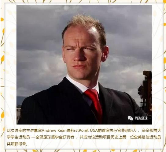 此次讲座的主讲嘉宾Andrew Kean是FirstPoint USA的首席执行官兼创始人, 辛辛那提大学员工运动员 —全额足球奖学金获得者, 并成为该运动项目历史上第一位全美最佳运动员奖项获得者。